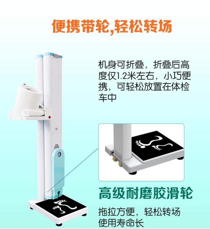 SH-600GX為便攜式身高體重血壓心率一體機,專為“上山下鄉(xiāng)”而設(shè)計,它的一大亮點就是折疊帶輪,折疊后僅1.2米,這一點彌補了多數(shù)健康一體機無法折疊的囧況,完美解決了下鄉(xiāng)體檢、折疊裝車難、移動轉(zhuǎn)場難的問題。