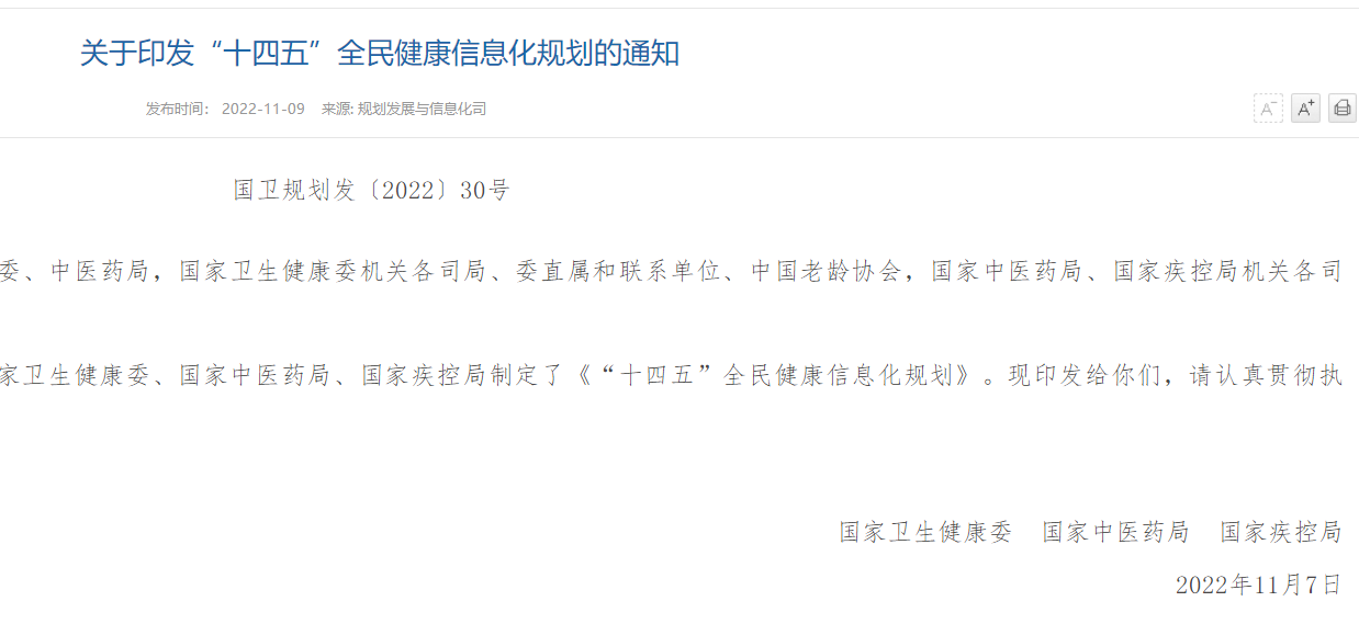 為貫徹落實黨中央、國務院的決策部署,統(tǒng)籌推動全民健康信息化建設,進一步推進新一代信息技術與衛(wèi)生健康行業(yè)深度融合,將數字技術與系統(tǒng)思維貫穿到健康中國、數字中國建設的全過程,充分發(fā)揮信息化在衛(wèi)生健康工作中的支撐引領作用,國家衛(wèi)生健康委聯(lián)合國家中醫(yī)藥局和國家疾控局根據全民健康信息化工作面臨的新形勢新任務,堅持“統(tǒng)籌集約、共建共享,服務導向、業(yè)務驅動,開放融合、創(chuàng)新發(fā)展,規(guī)范有序、安全可控”的基本原則,以引領支撐衛(wèi)生健康事業(yè)高質量發(fā)展為主題,編制印發(fā)《“十四五”全民健康信息化規(guī)劃》(以下簡稱《規(guī)劃》)。